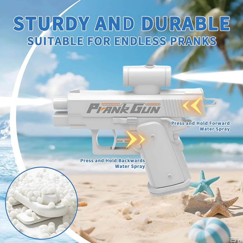 Deze waterpistool ter grootte van een handpalm maakt elk watergevecht twee keer zo spannend met stralen die in beide richtingen schieten. Gebruik de voorste trekker voor een rechte straal of verras je tegenstander met de verborgen achterste spuitmond. Het is lichtgewicht, lekvrij en klaar voor onmiddellijke actie.