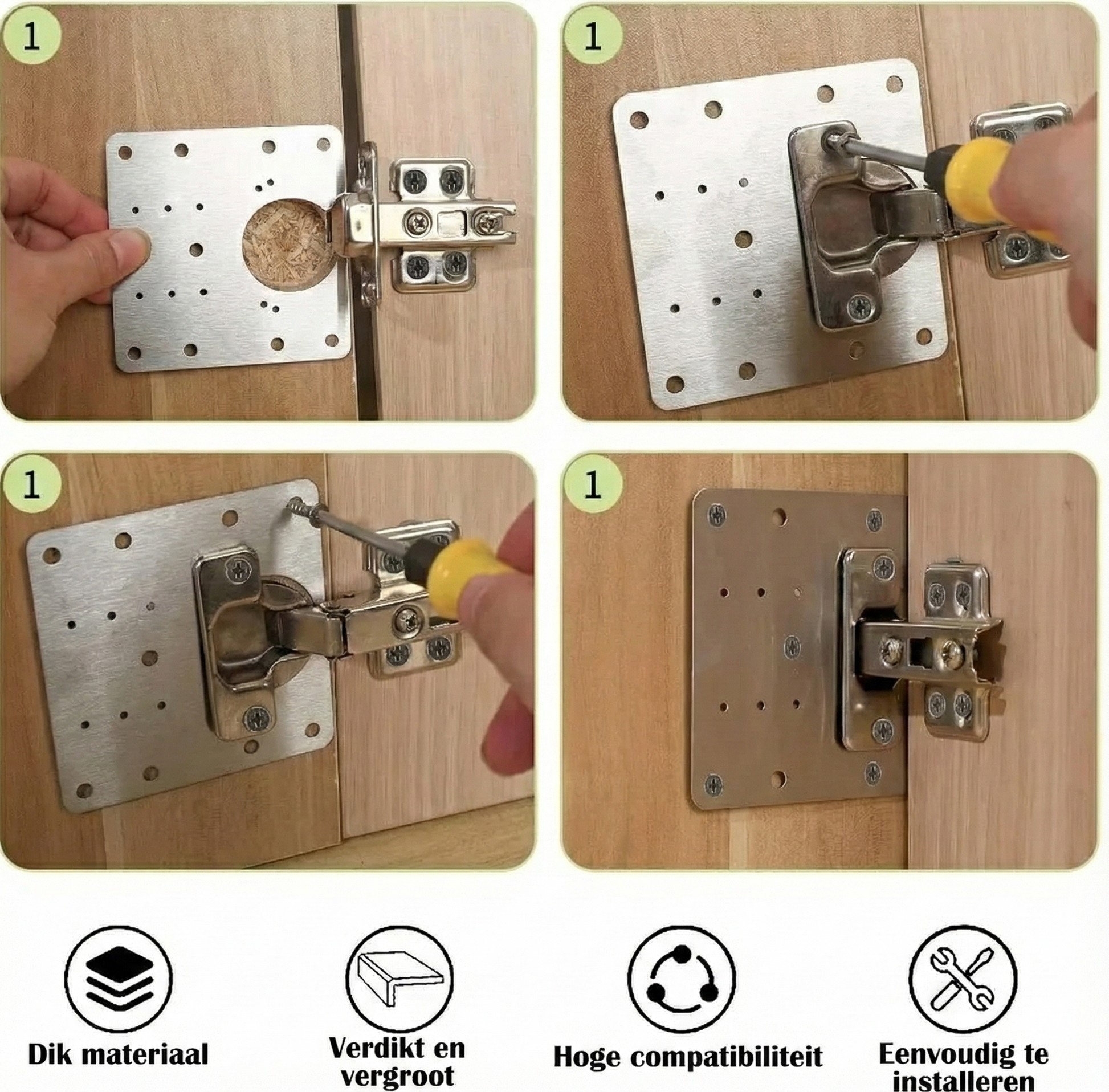 Deze scharnieren zijplaat herstelt en versterkt losse of beschadigde scharnieren.