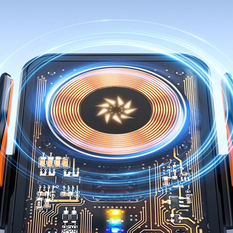 INTELLIGENT TEMPERATUUR CONTROLE CHIP - Detelefoonhouder is uitgerust met een temperatuurcontrolechip die de warmte die vrijkomt tijdens het opladen effectief regelt. Dit helpt oververhitting voorkomen en zorgt ervoor dat je apparaat veilig en efficiënt wordt opgeladen.
